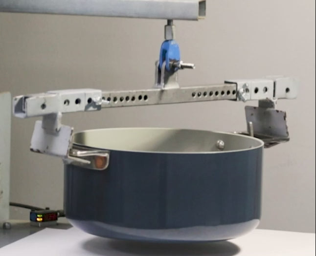 In this test, the pan is filled in with an extra load and undergoes 15,000 cycles of up and down. The test wants to ensure that the cookware handle and its fixing system won’t have any permanent distortion or loosening over time.