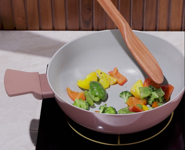 Our ceramic surface allows for healthier cooking with less oil and makes cleaning effortless. The glass-like porcelain enamel coating ensures easy maintenance and durability, reducing the need for scrubbing and extending your pan's lifespan.